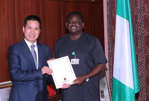 Director Political Section Embassy of the People’s Republic of China, Mr. Du Sheng, The Chinese Ambassador to Nigeria, Mr. Zhou Pingjian, Special Adviser to the President on Media and Publicity, Mr Femi Adesina and Deputy Director, Media State House, Mr Abiodun Oladunjiye during the presentation of Congratulatory letter of the Chinese President Xi Jinping on the Re-Election of President Buhari Friday at the State House Abuja. PHOTO; SUNDAY AGHAEZE. 1ST MARCH 2019.