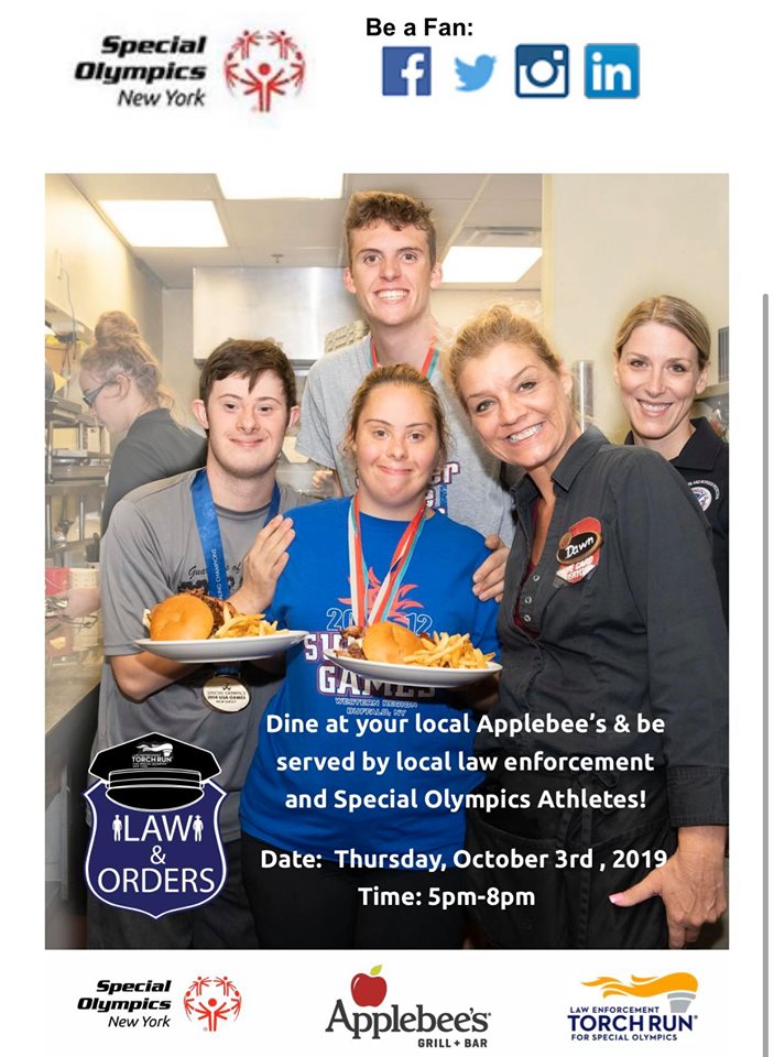 Please come join members of the Cuba Police Department and other agencies as we partner with Special Olympics New York at Applebee’s in Olean. Officers and Deputies will be volunteering their time to serve tables to raise money for the Special Olympics. There will also be Special Olympics Athletes on hand assisting us. We hope to see you there!