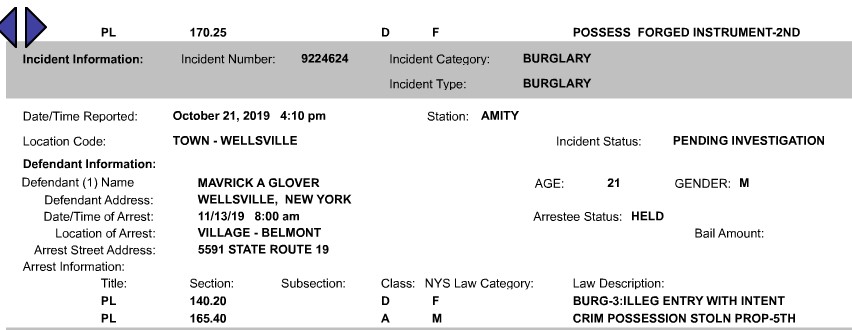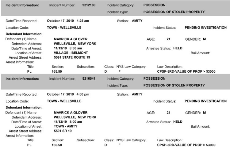 A Wellsville man has been accused of committing multiple felony crimes. State police arrested 21-year-old Mavrick Glover. He was charged with burglary, possessing a forged instrument, two counts of third-degree criminal possession of stolen property valued at over $3,000 and a misdemeanor count of possessing stolen property. He was initially detained. Troopers said the alleged crimes occurred in the town of Wellsville between October 17th and 21st.